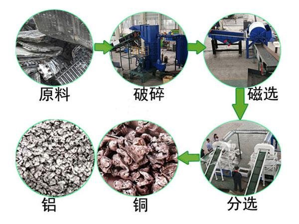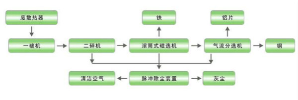 舊散熱器銅鋁破碎分離生產(chǎn)線(xiàn)是通過(guò)撕碎機(jī)、破碎機(jī)、磁選機(jī)、氣流比重分選機(jī)等一系列設(shè)備組合而成: